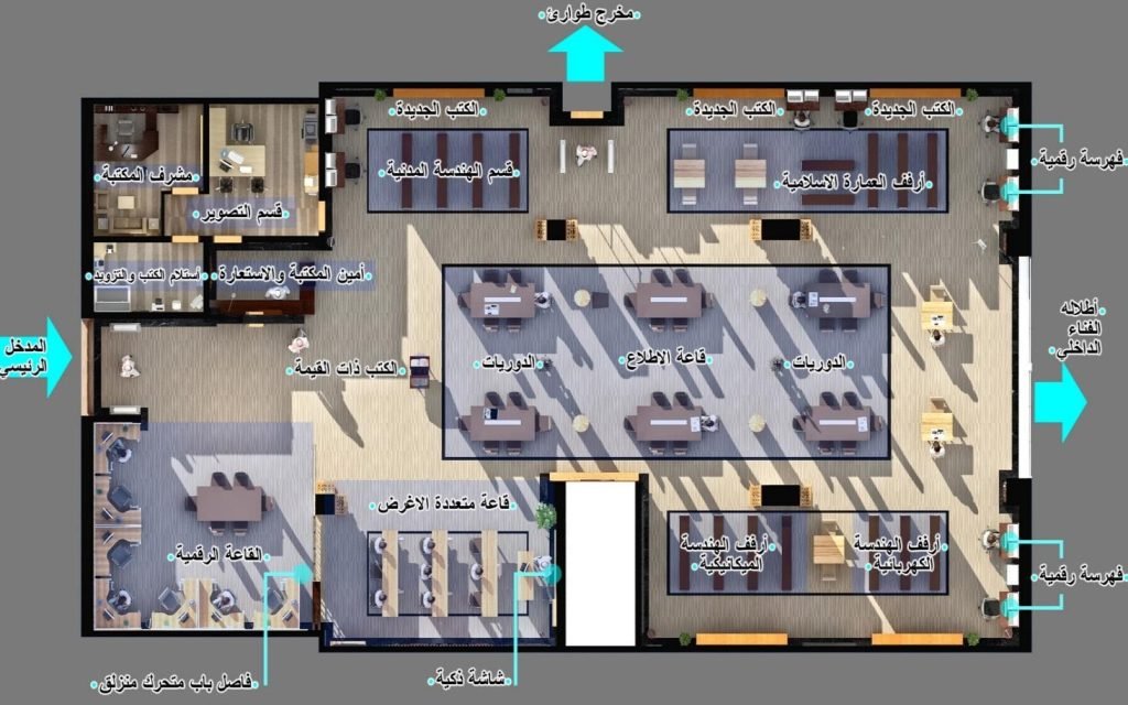 Developing the interior design of the library department Umm Al-Qura - Mecca In cooperation with Afnan Engineering Consulting Office, the university’s main library was renovated and redesigned. In addition to some development of the interior areas.